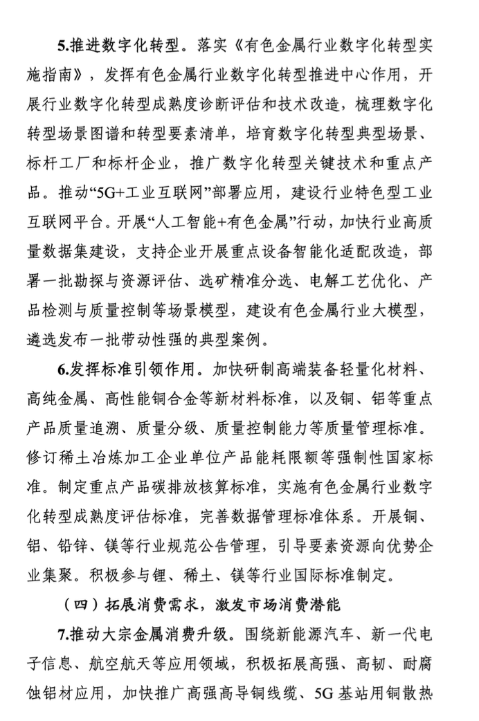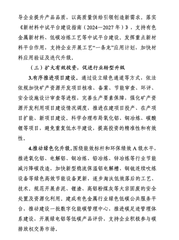 三是扩大有效投资,促进行业转型升级。通过设立绿色通道等方式,依法依规加快矿产资源开发项目核准、备案、节能审查、环评、安全设施设计审查等进程。科学合理布局氧化铝、铜冶炼、碳酸锂等项目。推进氧化铝、电解铝、铜冶炼、铅冶炼、锌冶炼等行业节能减污降碳改造。推进碳足迹管理体系建设。开展“人工智能+有色金属”行动,建设有色金属行业大模型。加快研制高端新材料标准以及重点产品质量管理标准,制定重点产品碳排放核算标准,开展铜、铝、铅锌、镁等行业规范公告管理。