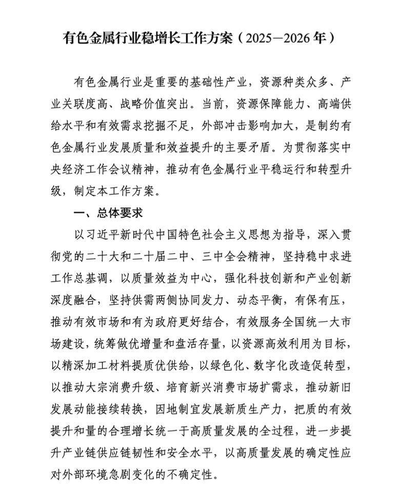 《工作方案》提出,2025—2026年,有色金属行业增加值年均增长5%左右,经济效益保持向好态势,十种有色金属产量年均增长1.5%左右,铜、铝、锂等国内资源开发取得积极进展,再生金属产量突破2000万吨,高端产品供给能力不断增强,绿色低碳、数字化发展水平持续提升。