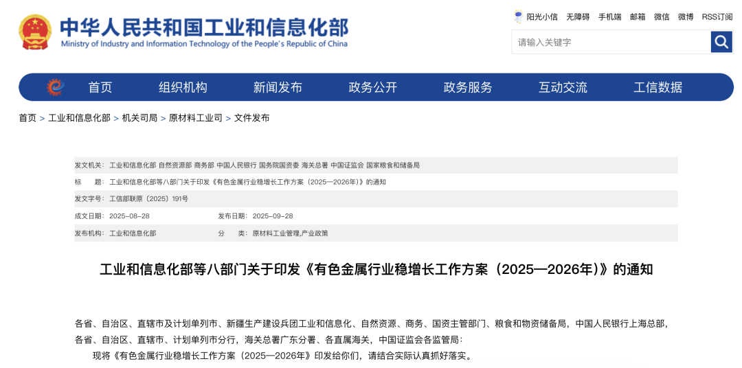 9月28日,工业和信息化部等八部门印发《有色金属行业稳增长工作方案(2025—2026年)》。