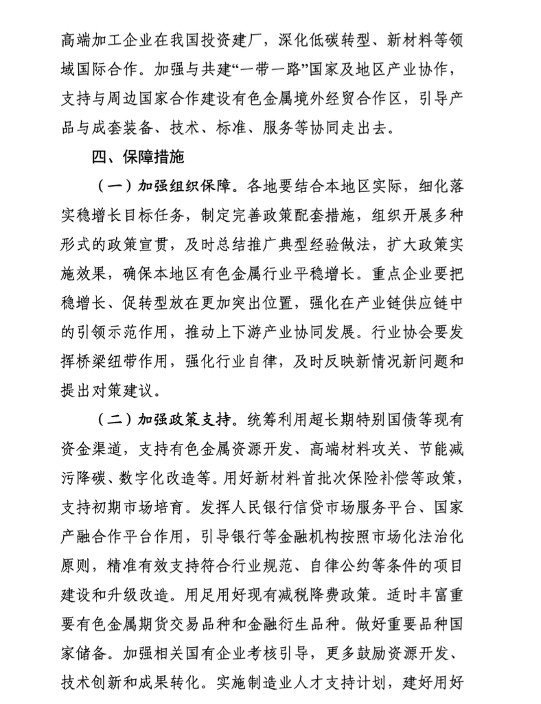 五是深化开放合作,提高国际化发展水平。指导和帮助企业积极应对国外不合理贸易限制措施,引导高端新材料及制品等精深加工产品合规出口。加大阳极铜、氧化铝等初级产品进口。加快制定钨等再生金属进口标准,支持符合要求的再生资源进口。稳步推进境外有色金属项目建设,支持与周边国家合作建设有色金属境外经贸合作区,引导产品与成套装备、技术、标准、服务等协同走出去。